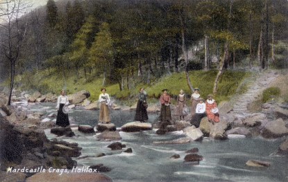 In my previous post I included some pictures of Gibson Mill and Hardcastle Crags, all of which were on my pinboard. Alongside them was this postcard. Taken in 1912, twenty years before The Companion begins, it was the inspiration for a scene in the novel. Billy is revisiting The Palace when he sees “on the stepping stones a row of women posed for a photograph, hats held out in front of them like they’d each caught a fish.”